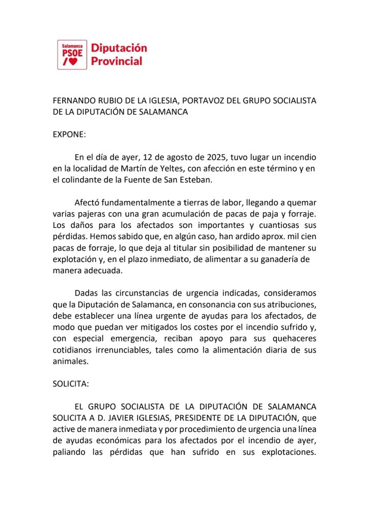 Ante esta situación, el portavoz del Grupo Socialista en la Diputación, Fernando Rubio, y el diputado provincial de Ciudad Rodrigo, Carlos Fernández Chanca, registraron el pasado 13 de agosto en la Diputación una iniciativa donde el PSOE “demanda y solicita” que desde el equipo de gobierno se active “de manera inmediata y por procedimiento de urgencia” una línea de ayudas económicas para los afectados por el incendio de Martín de Yeltes y La Fuente de San Esteban y así, “paliar en la medida de los posible”, han defendido los socialistas, “las pérdidas que han sufrido las explotaciones agroganaderas en la zona”.