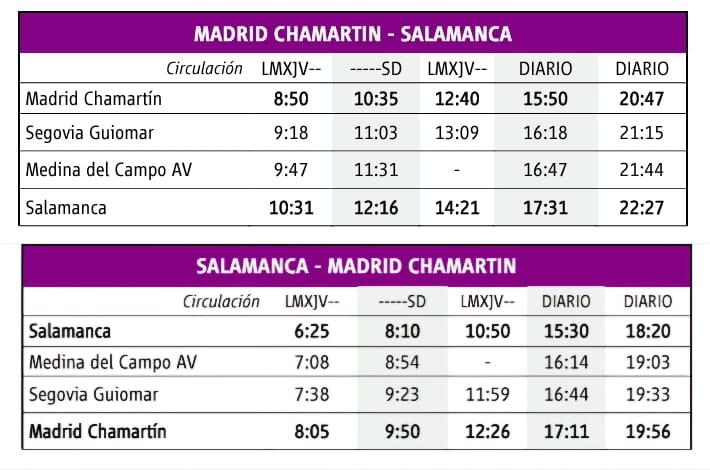 El horario de salida de este servicio desde la estación de Salamanca será a las 10:50h, con llegada a Madrid a las 12:26h. En sentido inverso, el Alvia saldrá de la terminal de Madrid a las 12.40h, llegando a Salamanca a las 14:21h.