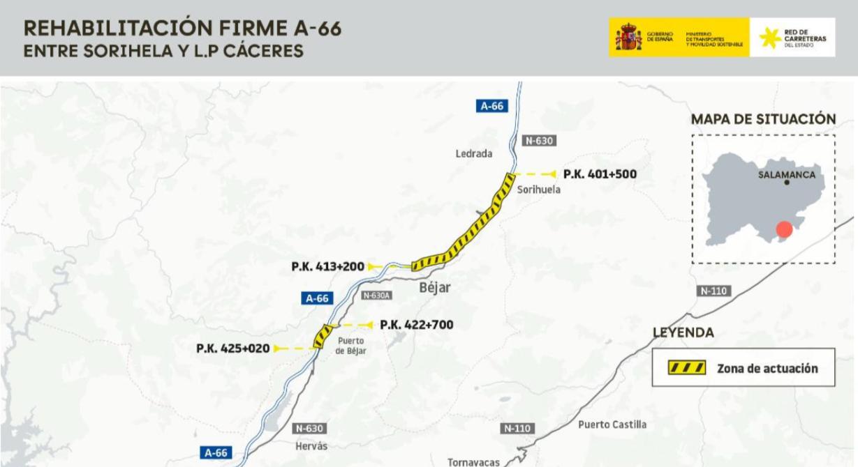 Se trabajará en dos tramos, entre los km 401 al 413 (entre Sorihuela y Béjar) y del km 422 al 425 (en Puerto de Béjar), tanto en el tronco de la autovía como en los ramales de los enlaces.